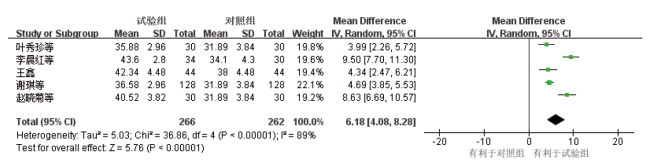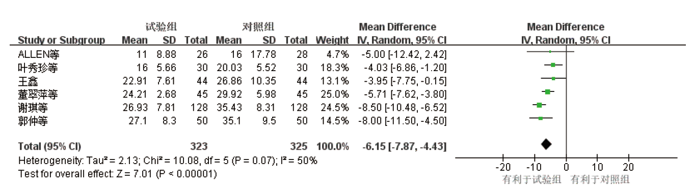 住院时间 | 6 | 50% | 0.070 | 随机 | MD | -6.15 | -7.87~-4.43 | <0.001 |