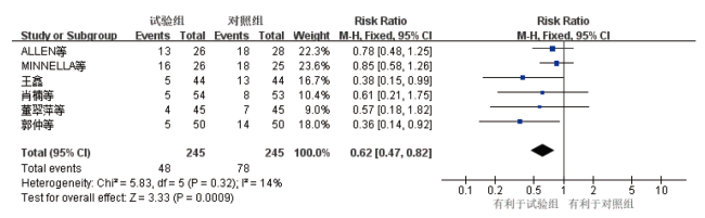 术后并发症发生率 | 6 | 14% | 0.320 | 固定 | RR | 0.62 | 0.47~0.82 | 0.001 |