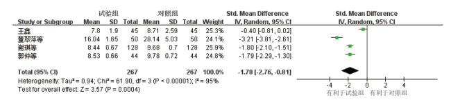住院费用 | 4 | 95% | <0.001 | 随机 | MD | -1.78 | -2.76~-0.81 | <0.001 |