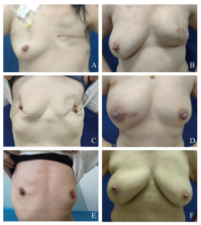 图1 接受腔镜手术或开放手术女性乳腺癌患者术后乳房外观注:A为左侧传统开放性乳房切除术后乳房外观;B为右侧传统开放性乳房切除术+假体植入乳房重建术后乳房外观;C为双侧保留乳头乳晕的全乳切除术(nipple-sparing mastectomy,NSM)后乳房外观;D为右侧NSM+假体植入乳房重建术后乳房外观;E为双侧腔镜逆序法NSM(E-NSM)术后乳房外观;F为右侧E-NSM+假体植入乳房重建术后乳房外观。 Figure 1 Postoperative appearance of female breast cancer patients undergoing endoscopic surgery or open surgery |