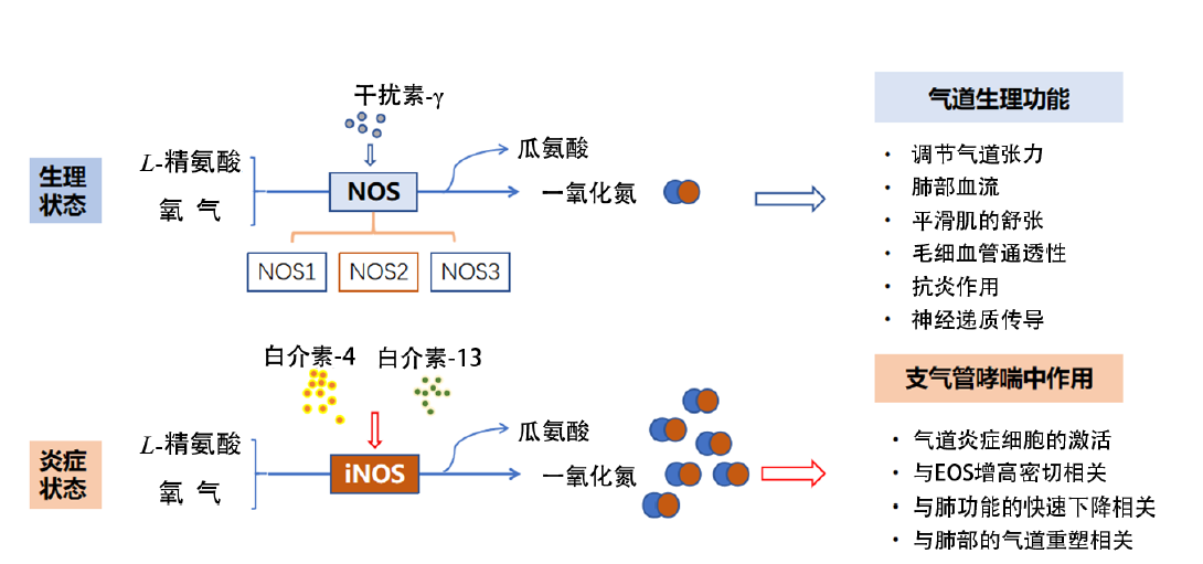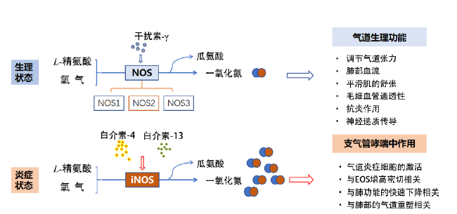 Fractional exhaled nitric oxide (FeNO) is a biomarker of type 2 inflammation, and produced by nitric oxide synthase (NOS) expressed on the airway epithelial cells, with the substrates of L-arginine and oxygen. Type 2 cytokines such as interleukin (IL)-4 and IL-13 can up-regulate inducible NOS, which results in the abundant production of NO. NO plays an important role in the pathogenesis of bronchial asthma, and is closely associated with the airway inflammation and remodeling, reduction of lung function and eosinophil infiltration, etc. The technique of FeNO test is applied in the clinical diagnosis of asthma, predicting the response to steroids and evaluating the compliance of asthmatic patients. In recent years, it also plays a guiding role in choosing the optimal biologics for individual therapy for patients of asthma. As a non-invasive, convenient, and economical method, the role of FeNO in the diagnosis and treatment of asthma will be better understood and applied.