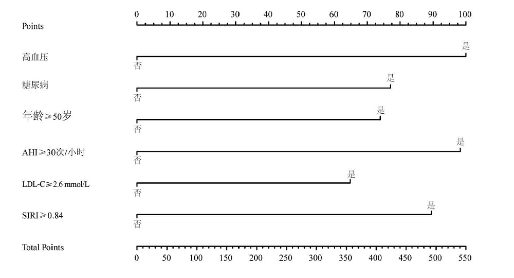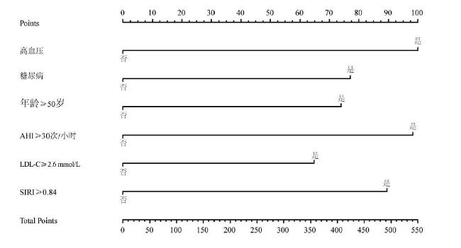 表4 SIRI与OSAHS合并冠心病的传统危险因素间的预测价值比较Table 4 Comparison of predictive value between traditional risk factors and SIRI of OSAHS with CHD |