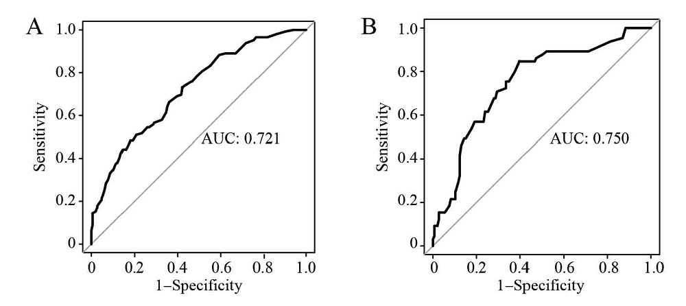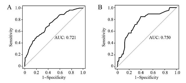 图4 训练集与验证集的ROC曲线注:A为训练集,B为验证集。 Figure 4 The ROC curves for the training set and the validation set |