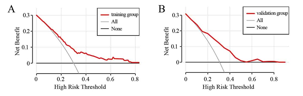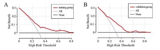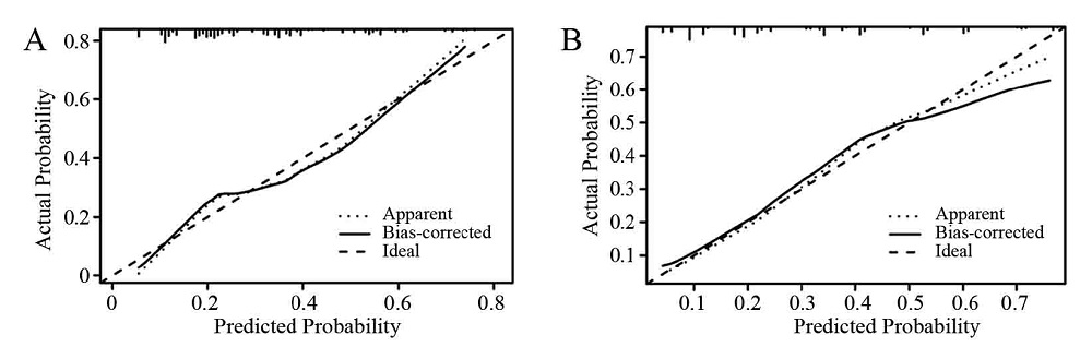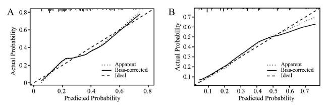 图5 训练集与验证集的校准曲线注:A为训练集,B为验证集。 Figure 5 Calibration curves for the training set and the validation set |