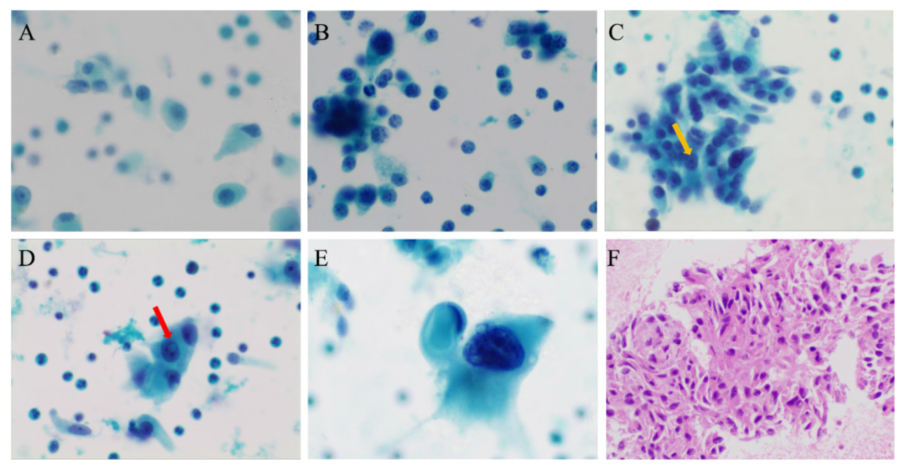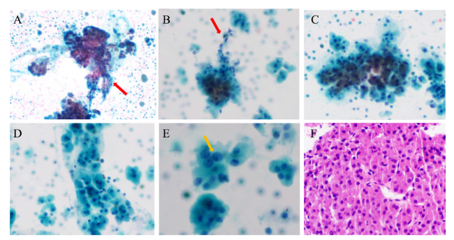 图3 甲状腺髓样癌的细针穿刺细胞学检查结果注:A可见以单个、散在分布的肿瘤细胞为主;B可见细胞聚集成小簇状,部分粉尘状细胞的核明显;C可见细胞形成小巢状,大小不一,形态多样,呈梭形、上皮样或圆形,黄色箭头所指可见小核仁;D红色箭头所指可见核内包涵体;E可见单个体积巨大的肿瘤细胞,胞浆丰富,嗜酸,核常常偏位,核染色质深;F可见细胞核扭曲、核形不规则,胞浆丰富、嗜酸,似有极向。A~E为液基细胞学巴氏染色,×400;F为细胞蜡块HE染色,×200。 Figure 3 Fine-needle aspiration cytology of medullary thyroid carcinoma |