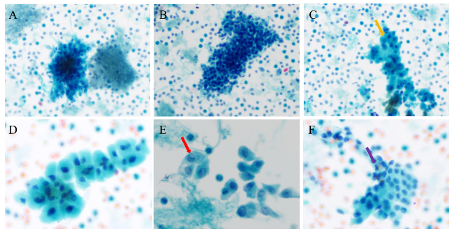 图1 嗜酸细胞肿瘤的细针穿刺细胞学检查结果注:A、B可见大片或小片状分布的嗜酸细胞及毛细血管穿越现象,红色箭头所指可见拖尾的血管内皮细胞;C、D可见散在或小片状分布的嗜酸细胞聚集现象;E可见嗜酸细胞胞浆丰富、浓厚,3~10个细胞呈群分布,黄色箭头所指可见核膜轻微不规则及小核仁;F可见嗜酸细胞平铺呈团排列,细胞间似以镶嵌状或推挤式排列。A~E为液基细胞学巴氏染色,F为细胞蜡块HE染色,A×100,B~D×200,E×400,F×200。 Figure 1 Fine-needle aspiration cytology of oncocytic thyroid neoplasm |