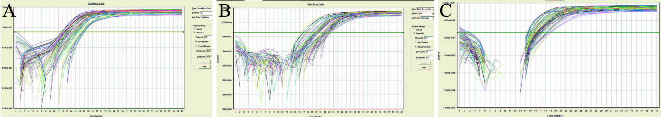 实时荧光定量PCR反应,以循环数为横坐标,实时荧光强度为纵坐标,两者形成S型扩增曲线,荧光强度随模板循环数的增加而增加,经过指数扩增期、线性扩增期之后到达平台期,各肠道菌群的扩增曲线见图 2。