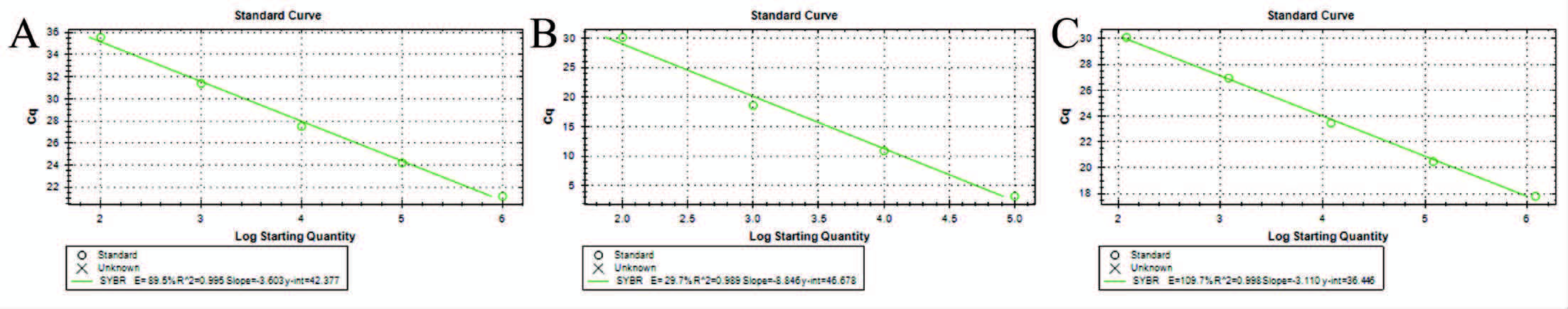 以各标准品的拷贝数的对数值为横坐标,以Ct值为纵坐标,由软件自动绘制出各标准菌的标准曲线,拷贝数与Ct值之间的线性关系可以计算出待测样本中各个细菌的拷贝数。大肠埃希菌属: Y=-3.603X+42.377,r= 0.999; 双歧杆菌属:Y=-8.846X+46.678,r= 0.999;乳酸杆菌属:Y=-3.310X+36.446,r=0.998;r值均大于0.990,见图 3。