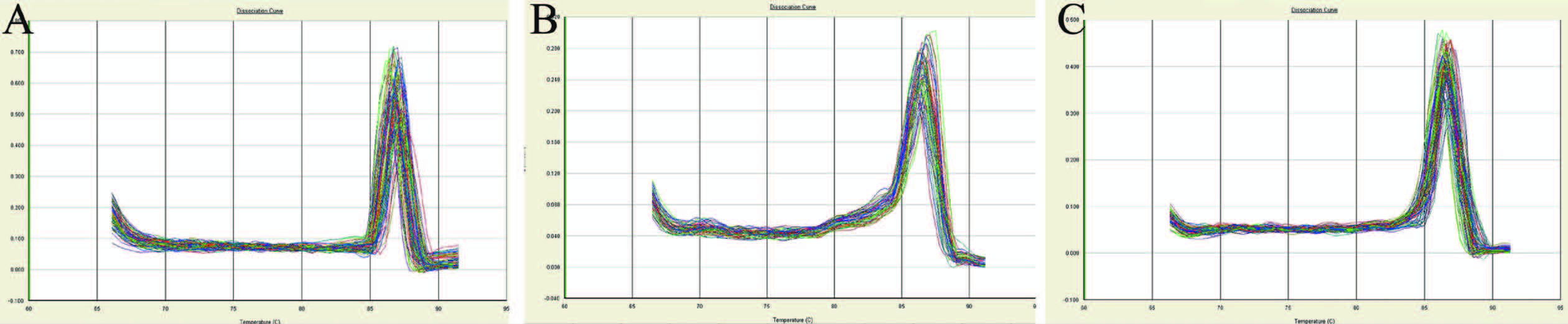 SYBR Green染料是一种非特异的染料,可嵌合于双链DNA的小沟,只有双链DNA才会发出荧光,在延伸结束阶段采集荧光信号,熔解曲线是对PCR引物特异性进一步验证,观察扩增产物是否为所需要目的产物,本研究3种细菌的熔解曲线均为单峰,说明扩增产物为目标产物,且无非特异性扩增,见图 4。