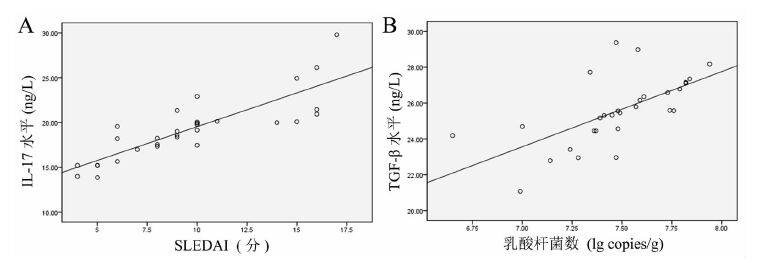 五、统计学处理使用SPSS 17.0软件对数据进行分析。计量资料以x±s表示,组间比较采用独立样本t检验,组内治疗前后比较采用配对t检验,外周血IL-17与SLEDAI评分以及TGF-β与乳酸杆菌的关系采用简单线性回归及双变量相关性分析。P<0.05 为差异有统计学意义。
