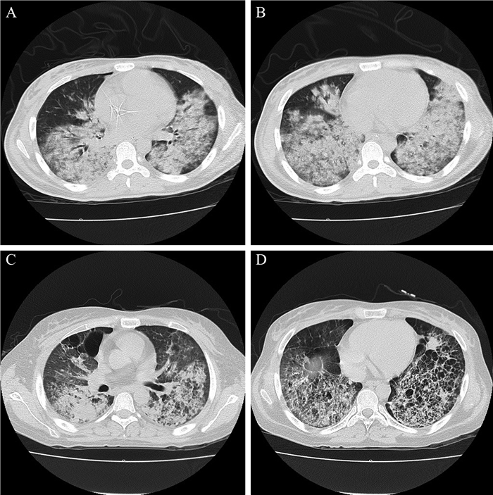 图 1 一例AIP患者的影像学检查结果 A、B:2017年4月5日转入ICU时患者的胸部CT,双肺可见多发边缘模糊的片状稍高密度影,以双肺下叶为主;C、D:2017年11月13日患者随访的胸部CT,双肺可见斑片状、网格状阴影,范围较前缩小 |