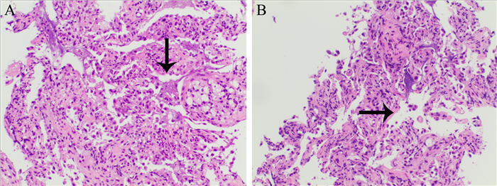 3. 诊疗经过入住神经内科后4 d予抗感染、营养神经等治疗,患者有反复发热伴气促,每日最高体温均在39℃以上。完善胸部CT,结果提示双肺多发渗出,见图 1A、B。动脉血气示氧分压51 mm Hg,考虑存在Ⅰ型呼吸衰竭转入内科ICU。转入内科ICU后,完善病原学检查并予哌拉西林钠他唑巴坦钠(4.5 g静脉滴注,每日3次,连用4 d)、莫西沙星(0.4 g/d静脉滴注,连用5 d)、替加环素(100 mg静脉滴注,每日2次,连用4 d)、伏立康唑(0.2 g静脉滴注,每日2次,连用6 d)等积极抗感染治疗。实验室呼吸道病原体9项(包括嗜肺军团菌1型-IgM、肺炎支原体-IgM、肺炎衣原体-IgM、Q热立克次体-IgM、腺病毒-IgM、呼吸道合胞病毒-IgM、甲型流感病毒IgM、乙型流感病毒-IgM、副流感病毒-IgM)、肺炎支原体血清学、多次纤维支气管镜(纤支镜)检查及肺泡灌洗病原学检查结果均无异常。风湿体液免疫全套、巨细胞病毒、EB病毒抗体以及多次真菌D -葡聚糖、GM试验均无异常。患者仍反复气促、存在呼吸衰竭,在征得家属同意后行经皮气管切开术呼吸机辅助通气。由于患者体温反复升高,病因不明,遂行纤支镜下肺活检。肺活检病理报告:可见肺泡间隔增宽,纤维母细胞增生,伴灶性坏死,部分区域肺泡塌陷,部分肺泡可见肺泡上皮脱落,腔内见纤维素样渗出与泡沫细胞、炎症细胞混合而成的栓子样物,偶见机化现象,形态考虑AIP伴肺泡损伤(图 2)。予甲泼尼龙80 mg每日2次治疗,1周后加用环磷酰胺0.4 g每周1次,共7次,累积量共2.8 g。25 d后经脱机训练后脱机成功并无再发热。肾上腺皮质激素(激素)逐渐减量并拔除气切套管,一般情况良好出院。患者出院后定期返院复查,胸部CT可见双肺斑片状、网格状阴影,范围较前缩小,见图 1C、D。