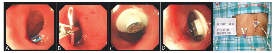 三. 诊断和治疗入院诊断:1.食管癌术后复发并吻合口狭窄;2.食管癌根治术后;3.重度营养不良。患者入院后经完善相关检查,确定无手术禁忌证后,于2015年11月3日接受经皮内镜下胃肠造瘘术。术前准备同镇静胃镜准备。术中患者取仰卧位,头左侧,静脉注射安定4 mg和咪哒唑仑。待患者进入睡眠状态后进镜,在距门齿18 cm处见吻合口,黏膜粗糙易出血,取活检,吻合口狭窄难进镜,更换超细胃镜后继续进镜至空肠,充分注气,反复寻找、尝试,左上腹透光不明显,在空肠处未能确定理想的穿刺点。予退镜至十二指肠球部,在剑突下2 cm处见腹部透光最亮处,经床边B超定位此处无其它腹部器官后,选取此处为造瘘部位。体外常规消毒铺巾,2%利多卡因局部浸润麻醉,并以负压针吸试验,确认所选部位的皮下至胃部之间无大血管及其它脏器[1]。在已选取的造瘘处皮肤上作0.5 cm小切口,用穿刺针垂直于皮肤刺入十二指肠球部,内镜下见穿刺针刺入十二指肠球腔内(图 1A),拔出针芯,将长粗引导丝线从套管放入十二指肠球腔内,内镜下用异物钳夹取十二指肠球腔内丝线(图 1B),并与内镜同时退出口腔外,将引导丝线头端的丝线环与蕈状胃造瘘管尾部的丝线环行“8”字连接,牵拉腹壁外引导丝线的另一端将蕈状胃造瘘管经口咽、食管和胃逆行拉出腹壁,再次插入内镜,观察胃造瘘管蕈状橡皮垫紧贴十二指肠球部黏膜(图 1C),于腹壁外固定胃造瘘管,连接注射器,经注射器向胃造瘘管内注水通畅(图 1D),观察局部黏膜及瘘口无出血,予消毒包扎伤口,固定胃造瘘管(图 1E)。术后予以管饲,并保持造瘘口清洁干燥,患者营养状况较前明显好转,生活质量提高。