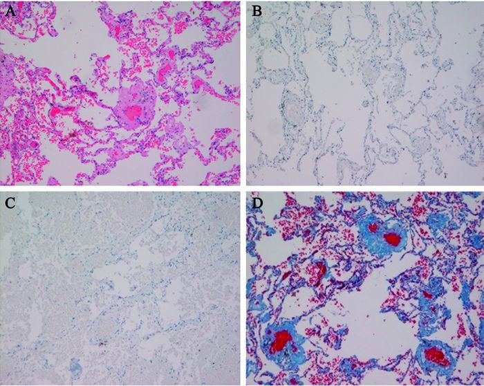 图 1 一例非吸烟肺功能正常者肺组织的病理结果(光镜,×100) A:HE染色;B:TSLP染色;C:Ki-67染色;D:Masson染色 |