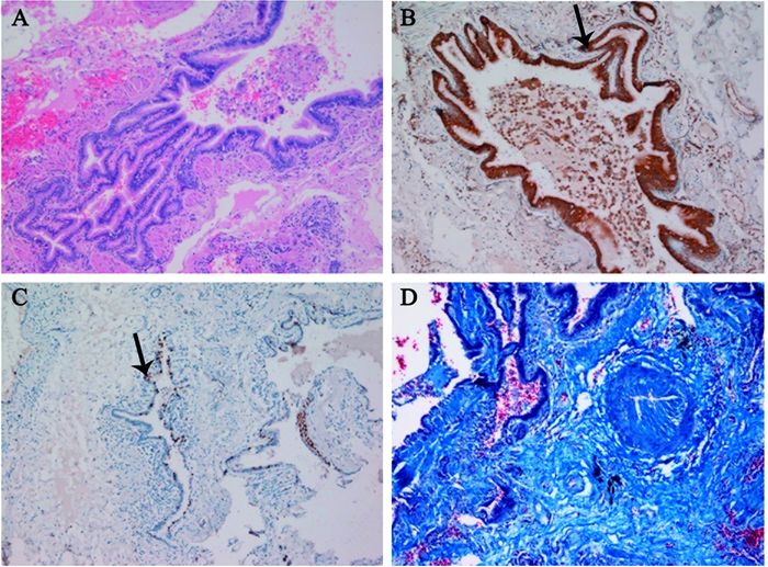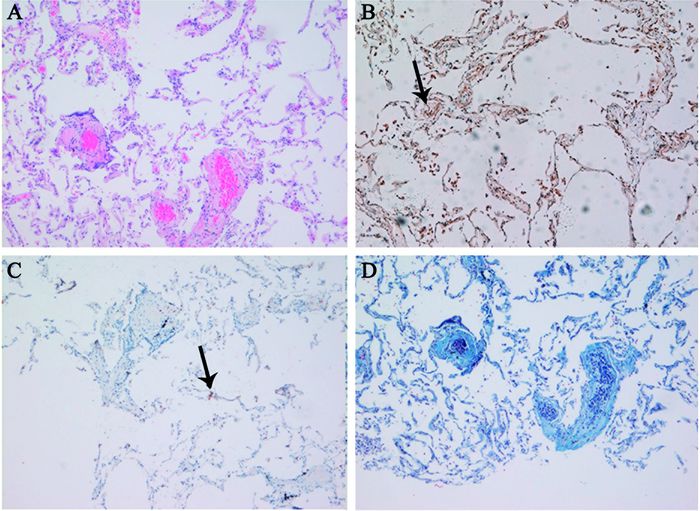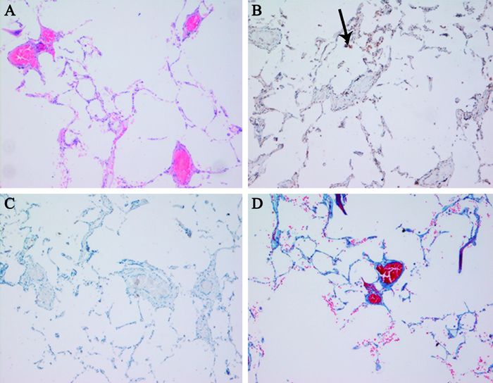 图 2 一例吸烟肺功能正常者肺组织的病理结果(光镜,×100) A:HE染色;B:TSLP染色;C:Ki-67染色;D:Masson染色;箭头示阳性染色 |