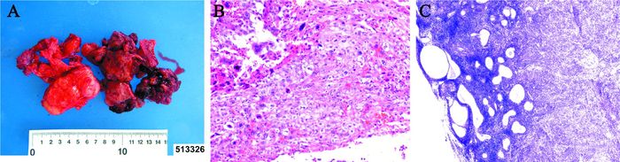 图 1 一例卵巢癌肉瘤的手术切除标本及病理切片图 A:肉眼观肿瘤组织;B:病理切片(苏木素-伊红染色,×200);C:病理切片(苏木素-伊红染色,×100) |