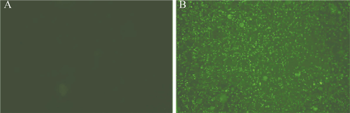 图 1 重组慢病毒LPP-Mm26645-Lv203-400转染DC荧光显微镜观察 A:未感染慢病毒的DC;B:感染重组慢病毒LPP-Mm26645-Lv203-400的DC (曝光时间0.8 s,×200) |