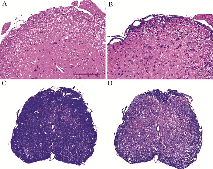 采用人工合成的MOG35-55多肽免疫6~8周的C57BL/6雌性小鼠后,第2~3日小鼠出现体质量下降,皮毛不光泽,行为不活跃,食欲下降,第4~6日体质量出现增长,在第7日采用人工合成的MOG35-55多肽二次免疫小鼠后,第9~10日小鼠体质量再次出现下降,第13、14日小鼠出现尾部拖曳无力,并逐渐出现单后肢、双后肢甚至四肢无力、瘫痪。第21~24日出现发病高峰,行为学评分为(2.0±1.6) 分,发病率大于80%。EAE组小鼠腰段脊髓有大量炎症细胞侵润,血管周围呈袖套样改变;对照组小鼠脊髓未见异常(图 2A、B)。EAE组小鼠腰段脊髓软膜下和血管周围明显的脱髓鞘,伴有中枢神经系统实质内炎症细胞浸润。对照组小鼠脊髓未见异常(图 2C、D)。