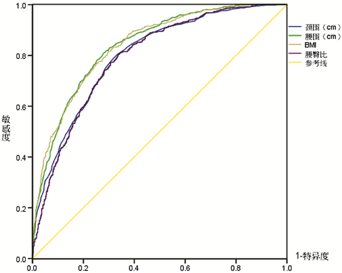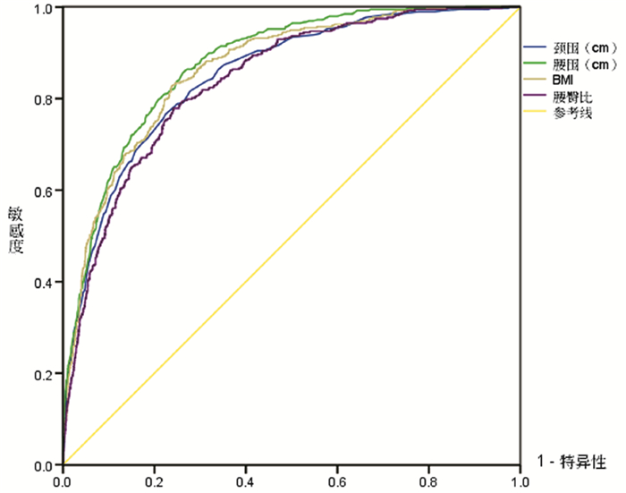 2. 人体测量学指标测量及标准颈围测量:调查对象清醒垂直端坐位,平视前方,平静呼吸,紧贴其喉结下缘使用经过校正的软皮尺测量颈围周径,精确到0.1 cm。腰围测量:体检者仅穿单衣裤,解腰带,双手下垂直立,双脚分开与肩同宽,平静呼吸,用软皮尺测量以肋骨下缘和髂前上嵴连线中点的水平位置最小周径,软皮尺紧贴但不压迫皮肤,精确到0.1 cm。臀围测量:取臀部最大周径(即股骨大粗隆的水平位置),精确到0.1 cm。身高和体质量的测量:采用全自动档光电体检机SK-TJ2通过接触式测量身高,精密传感器测量体质量,体检者排空膀胱,脱鞋,摘帽,只穿单衣,直立于测量仪上,双眼平视前方,身高测量精确到0.5 cm,体质量测量精确到0.1 kg。以上测量指标重复测量2次,取其平均值用于统计分析,并计算体质指数和腰臀比。BMI按公式BMI=体质量(kg)/[身高(m)]2计算。腰臀比=腰围(cm)/臀围(cm) 计算。