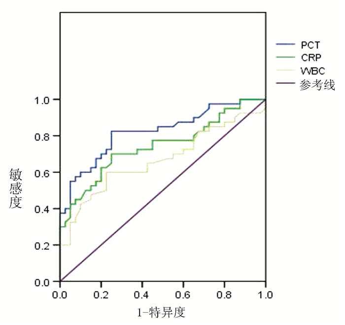 图 1 降钙素原、CRP、白细胞对SIRS的诊断价值 PCT:降钙素原;WBC:白细胞 |