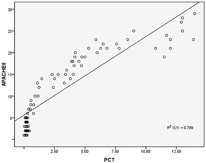 图 2 胆总管结石患者降钙素原与APACHE Ⅱ评分相关性分析 |