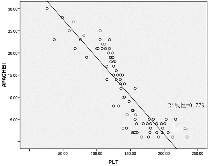 降钙素原与APACHEⅡ评分呈正相关,r=0.89, P < 0.001,见图 2。血小板与APACHE Ⅱ评分亦相关, r=0.88, P < 0.001,见图 3。