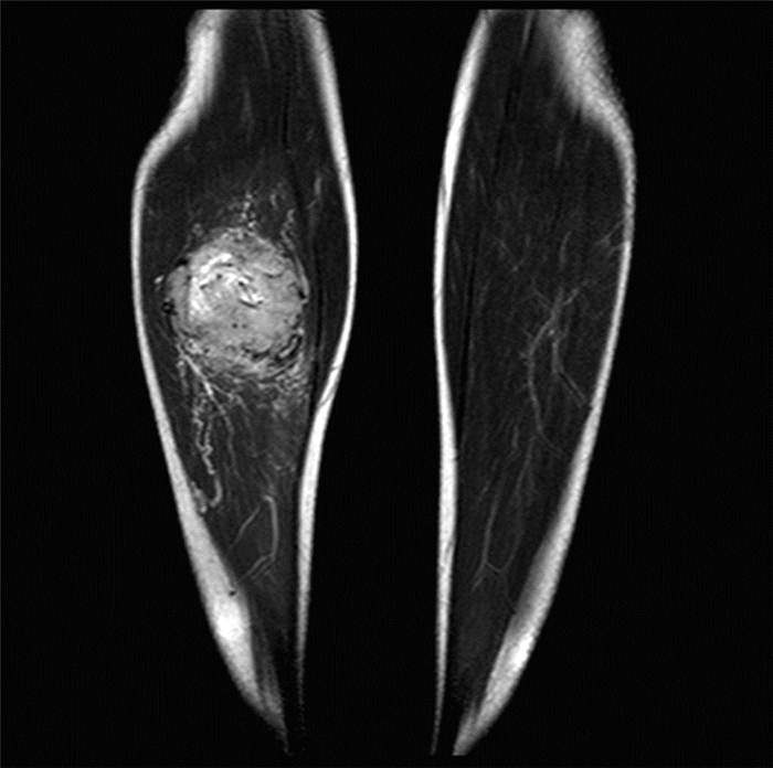 三、 影像学检查MRI示右小腿中上段背侧肌肉内占位(图 1),病灶大小约3.9 cm×5.8 cm×6.0 cm,增强扫描病灶明显强化,欠均匀,邻近骨皮质完整,未见明显异常信号影,考虑肿瘤性病变,血管源性可能性大。