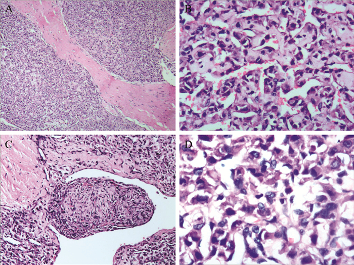 图 2 一例ASPS患者肿块组织病理切片的显微镜下所见(HE染色,A×40、B、C×100,D×200) A:瘤组织呈实性生长并且被纤维组织分隔,局部被分隔呈结节状;B:细胞巢之间有宽窄不等的血窦间隔;C:可见血管内瘤栓;D:高倍镜下细胞边界清晰,细胞核呈泡状,有明显的核仁,细胞核大小不齐,细胞浆呈嗜伊红颗粒状 |