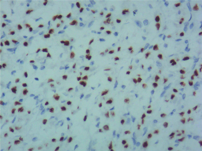 图 3 一例ASPS患者肿块组织病理切片的免疫组化染色结果(EnVision两步法染色,×100) 肿瘤细胞表达TFE3,胞核内强阳性 |