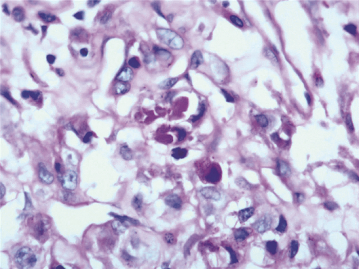特殊染色:PAS染色阳性,瘤细胞内可见针状或棒状结晶体(图 4)。