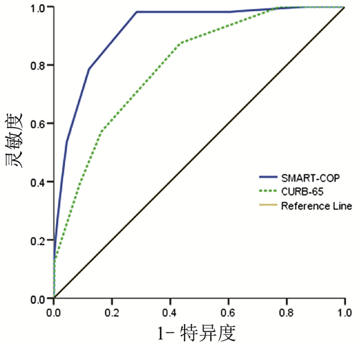 四、 统计学处理采用SPSS 18.0进行分析。连续计量资料行正态性检验,符合正态分布的计量资料以x± s表示,不符合正态分布的计量资料以中位数 (范围) 表示;计数资料以百分率表示。绘制SMART-COP评分和CURB-65评分对急诊科CAP患者需要机械通气预测的受试者工作特性 (ROC) 曲线,使用95%CI的曲线下面积 (AUC) 反映评分对机械通气的预测能力,AUC的组间比较使用Z检验[4]。P<0.05为差异有统计学意义。
