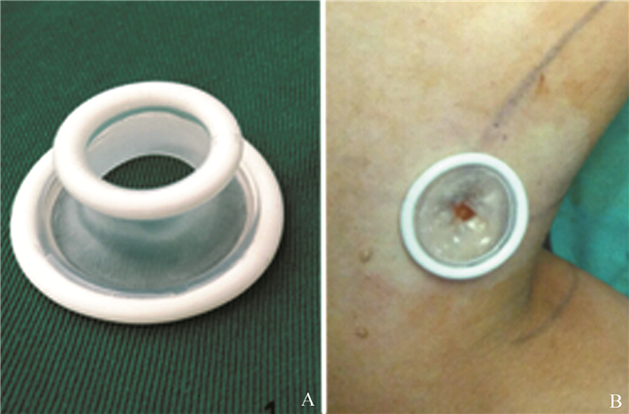 图 1 一次性切口牵开固定器及其应用 A:一次性切口牵开固定器;B:将固定环紧密卡在切口皮下组织层下,牵引环贴在切口周围皮肤表面上,保护切口皮肤 |