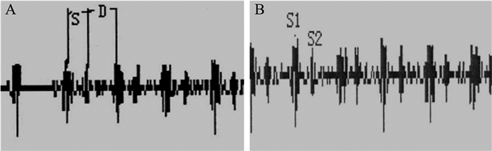 Ⅱ、Ⅲ、Ⅳ组患者均于产前检查确诊,后入院即刻进行心力储备检测,使用重庆睿凡科技发展有限公司生产的CC-D-Ⅰ运动心力监测仪 (包括心音脉搏传感器、心力监测信号采集器、计算机系统)。检查前告知孕妇平稳呼吸,检查开始后将心音脉搏传感器置于孕妇心前区心尖搏动处,记录心音图,提取心脏舒张期时限 (D)、收缩期时限 (S) 并计算两者比值D/S (图 1A),另提取第一心音幅值 (S1)、第二心音幅值 (S2),并计算两者比值S1/S2(图 1B),同时记录孕妇的心率。