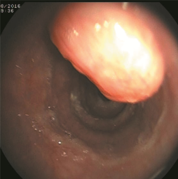 本例患者为65岁老年男性,主要临床症状为腹胀、腹水、纳差、乏力等肝硬化失代偿期表现,诊断为肝硬化失代偿期 (酒精性)5年,此次患者起病隐匿,临床症状不典型,入院前缺乏吞咽梗阻感或胸骨后不适等食管肿瘤特异性表现,易漏诊。本例患者特别之处在于食管肿物表面光滑,未见糜烂及溃疡形成,易误诊为平滑肌瘤,延误病情的诊治。本例结合胃镜、病理及免疫组化结果明确为肝硬化失代偿期合并PESCC,且病灶位于食管中上段,临床上极为罕见,与文献报道不一致。本例患者未进行食管静脉套扎及硬化治疗,原因可能与酒精、营养不良及反流有关,有待进一步研究证实。