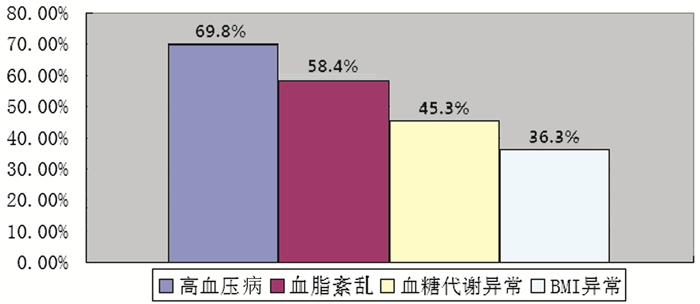 结果 一、 基本情况共245例患者,其中男136例(55.5%),女109例(44.5%);年龄(66.02±10.76) 岁。MS者88例(36%)。MS各组成成分发生率从高至低依次为高血压病、血脂紊乱、血糖代谢异常、BMI异常,见图 1。