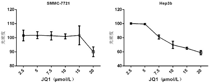 结果 一、JQ1对肝癌细胞的增殖影响使用不同JQ1药物浓度(具体浓度如图 1),处理肝癌细胞系Hep3b、SMMC-7721,对照组使用加入等量的DMSO,处理24 h后检测细胞增殖情况,发现在SMMC-7721细胞中,实验组(JQ1组)与对照组(DMSO组)相比,当JQ1药物工作浓度达到20 μmol/L时,细胞增殖受到抑制(t=5.00、P < 0.05),在Hep3B细胞中,实验组(JQ1组)与对照组(DMSO组)相比,当JQ1药物工作浓度达到7.5 μmol/L时,细胞增殖受到抑制(t=14.21、P < 0.05),并且两种肝癌细胞增殖能力随着药物剂量的增加而下降,见图 1。