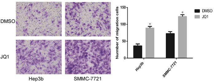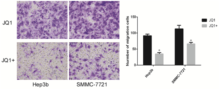 3. 细胞迁移实验取对数生长期细胞Hep3b、SMMC-7721,每种30×104个,每种细胞分设实验组与对照组,均种植于6孔板中,常规培养,实验组加入JQ1药物预处理,Hep3b中的JQ1药物工作浓度为2.5 μmol/L,SMMC-7721中的JQ1药物工作浓度为10 μmol/L,对照组加入等量的DMSO,加药常规培养24 h后进行Transwell迁移实验,Transwell小室上室外层预先涂上FN 10 μl,自然晾干,上室中加入含105个细胞无血清DMEM 200 μl,小室外培养基使用含10%胎牛血清DMEM培养基,内外培养基均加入JQ1,药物浓度与预处理细胞浓度一致。加入细胞后常规培养8 h取出,使用棉签擦去未穿过聚碳酸酯膜的细胞,使用含4%多聚甲醛固定10 min,后使用结晶紫染色30 min,使用普通光学显微镜随机拍照,每组取5个视野。