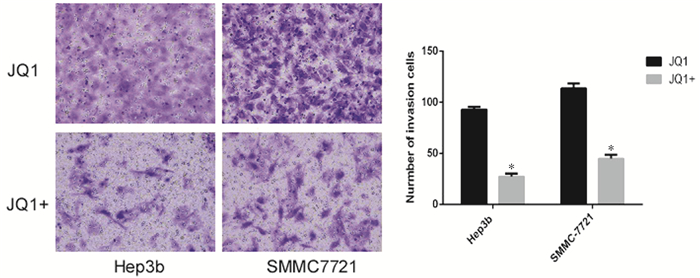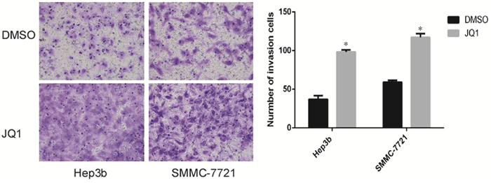 图 3 JQ1对肝癌细胞Hep3b、SMMC-7721细胞侵袭能力的影响 与其对照组(DMSO组)相比,*P < 0.01 |