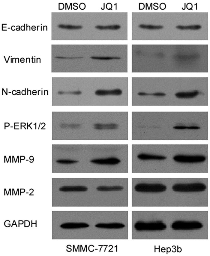 使用10 μmol/L JQ1处理SMMC-7721,使用2.5 μmol/L处理Hep3b后,蛋白免疫印迹法检测发现两种细胞系的实验组与对照组相比,MMP-9、MMP-2的蛋白表达量升高,N-cadherin、Vimentin升高,同时P-ERK1/2蛋白表达升高,见图 4。