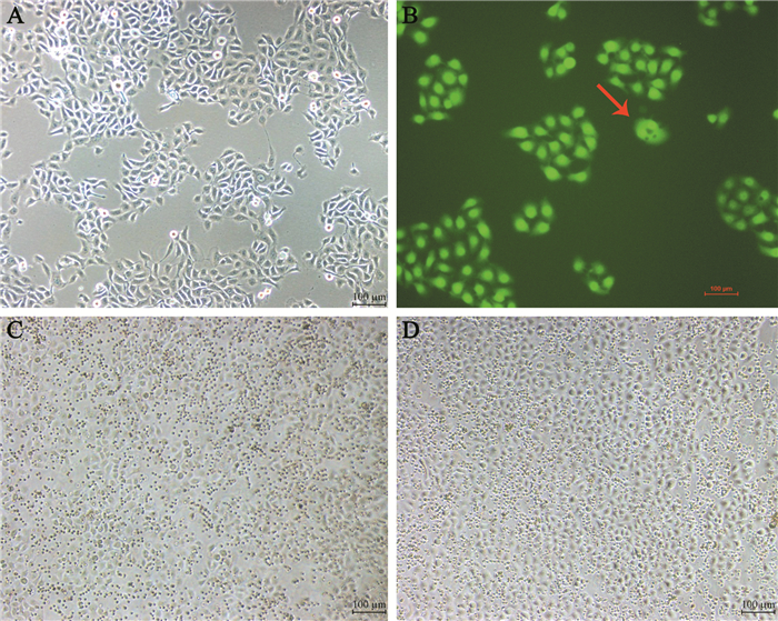 图 1 RSV感染前后的NHBE细胞形态对比(×100) A:正常NHBE细胞;B:被RSV感染的NHBE均呈绿色荧光,红色箭头所指为合胞体病变;C:RSV感染的NHBE与PMBC共培养0 h,可见PBMC悬浮在培养液上,呈单个或部分抱团;D:RSV感染的NHBE与PMBC共培养24 h,PBMC部分贴壁,数量有所减少,NHBE胞体更为肿胀、变圆 |