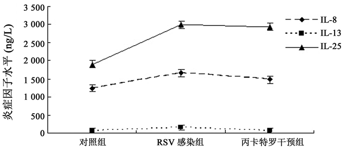 喘息患儿中,对照组、RSV感染组及丙卡特罗干预组的IL-8(F=138.339,P < 0.001)、IL-13(F=438.421,P < 0.001)、IL-25(F=389.223,P < 0.001) 比较差异均有统计学意义。RSV感染组的IL-8、IL-13和IL-25水平均高于对照组(LSD-t分别为6.905、20.327、7.553,P均 < 0.001);丙卡特罗干预组的IL-8、IL-13水平均低于RSV感染组(LSD-t分别为6.058、20.633,P均 < 0.001),2组间IL-25水平比较差异无统计学意义(LSD-t=1.134,P=0.264),见图 2。