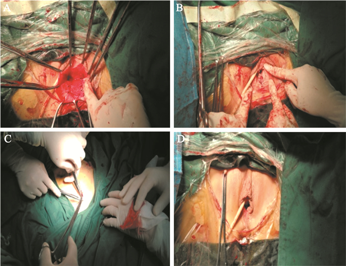 改良组的腹腔镜手术步骤与传统组相同,但经阴道部分的步骤为:先不将悬吊子宫网片与腹壁缝合,由其中1位助手通过阴道观察网片被拉伸后阴道状态及子宫颈高度,如阴道前壁仍膨出同时行传统阴道前壁修补,阴道后壁则行改良阴道后壁非穿刺重建术。将剩余网片剪成宽约3 cm、与阴道长度等长的长方形,分离阴道后壁直至子宫颈(图 1A),将网片一端缝合于子宫颈,两侧与阴道后壁筋膜缝合固定网片不移动(图 1B),修剪多余阴道壁,缝合阴道后壁包埋住网片。阴道填塞碘纺纱条,留置导尿管。最后将腹壁筋膜与子宫悬吊网片缝合固定。术后24 h取出碘纺纱条并拨除导尿管。手术过程见图 1。