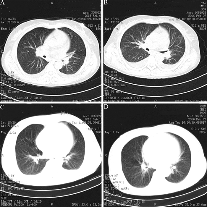 予患者头孢曲松钠他唑巴坦钠抗感染以及保肝、补液等治疗,其仍持续发热,咳嗽、咳痰,气促明显。2016年2月7日复查胸部CT无好转、双侧胸腔积液较前增多(图 1B),多次血培养阴性,骨髓穿刺检查提示感染骨髓象、无噬血细胞现象。腹部B超示肝、胆、胰、脾未见异常,RF、抗核抗体、抗核抗体谱等均阴性,CRP 196.58 mg/L,IL-6 1 063 pg/ml,降钙素原2.44 ng/ml,ESR 53 mm/h,且呈进行性升高,铁蛋白>1 500 μg/L。考虑患者持续发热、咳嗽、咳痰,胸部CT提示肺炎,予抗生素治疗效果不理想,伴咽痛,白细胞及中性粒细胞明显升高,肝功能异常,RF和抗核抗体均阴性,虽无典型关节痛、皮疹表现,但根据日本AOSD研究委员会提出的诊断标准需考虑排除AOSD的可能,遂予其甲泼尼龙琥珀酸钠80 mg静脉滴注、1次/12 h,治疗5 d后患者仍有高热,且体温高达40.3℃,复查CT见仍有双下肺炎的表现(图 1C),考虑有可能为糖皮质激素(激素)剂量不够,遂将甲泼尼龙琥珀酸钠改为80 mg静脉滴注、1次/8 h,治疗5 d后患者体温降至正常,改用地塞米松10 mg静脉滴注、1次/12 h,持续治疗4 d后改为口服泼尼松50 mg、2次/日,治疗3周后复查CT见双侧仅有少量胸腔积液(图 1D)。1个月后患者体温平稳,咳嗽、咳痰及气促好转,予其带药出院,泼尼松50 mg、2次/日(其后逐渐减量)。出院后随访2周患者体温正常,无咳嗽、咳痰,无心悸、气促等,继续随访半年,其无不适,情况稳定。