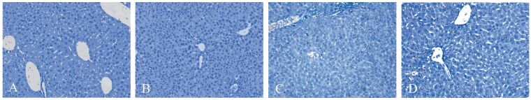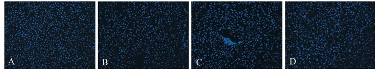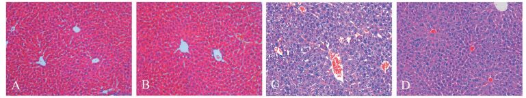 图 1 各处理组小鼠肝脏苏木素-伊红染色(×200) A:正常对照组;B:丁酸钠组;C:内毒素组;D:丁酸钠+内毒素组 |