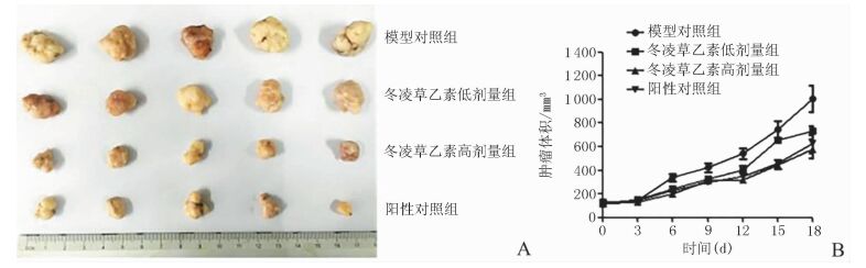 图 1 冬凌草乙素对裸鼠K562细胞皮下移植瘤体积的影响 A:肿瘤大体图;B:各组的肿瘤体积随时间的变化趋势 |