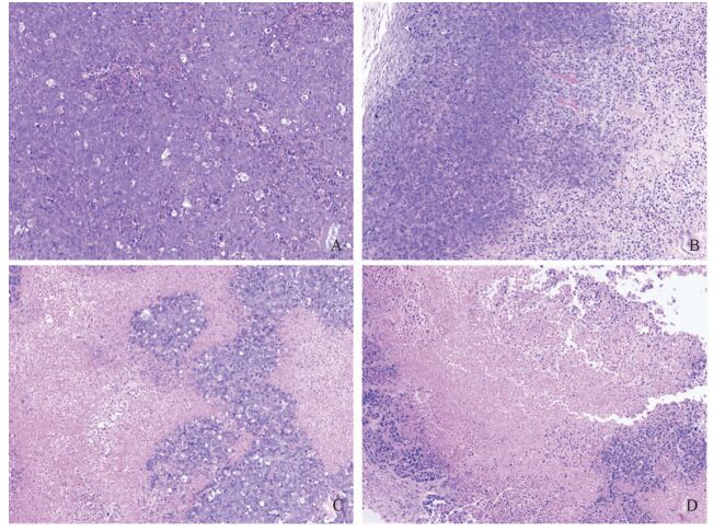光镜下所见凋亡一般累及单个或少数几个细胞,凋亡细胞呈圆形,胞浆红染,细胞核染色质聚集成团块状,由于凋亡细胞迅速被吞噬,又无炎症反应,因此在常规切片检查时一般不易发现。结果如图 2所示,光镜检测发现模型对照组瘤组织中癌细胞核大且包膜基本保持完整,胞内染色质排列整齐、分布均匀,坏死组织部分极少(图 2A);冬凌草乙素低剂量组能明显抑制肿瘤细胞体积,出血坏死较模型对照组增多且可见核分裂(图 2B);冬凌草乙素高剂量组肿瘤组织可见大片无结构的坏死红染区域,呈透明样(图 2C);阳性对照组少见核分裂,瘤组织出血坏死现象较为广泛且肿瘤细胞体积变小明显(图 2D),治疗效果与冬凌草乙素高剂量组相差不大。