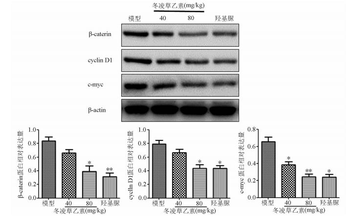 图 3 冬凌草乙素对K562皮下细胞移植瘤组织β-caterin、cyclin D1和c-myc蛋白表达的影响 与模型对照组相比,*为P<0.05,**为P<0.01 |