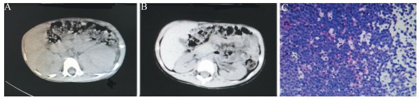 图 1 一例以AKI为首发症状的NHL患儿腹部CT及肾组织病理检查 A:治疗前腹部CT示双肾肿大;B:治疗后腹部CT示双肾体积恢复正常;C:肾组织病理检查示大量淋巴瘤细胞浸润(苏木素-伊红染色,×400) |
