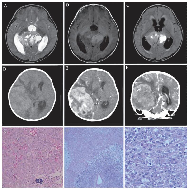 图 1 一例中枢神经系统AT/RT患儿影像学及病理检查图 A:MRI的T2加权像;B:MRI的T1加权像;C:液体衰减反转恢复(FLAIR)序列;D:CT平扫;E~F:CT增强扫描;G:病理检查显示组织形态单一(苏木素-伊红染色,×100);H:病理检查显示组织形态多样化(苏木素-伊红染色,×100);I:典型的横纹肌样细胞(苏木素-伊红染色,×400) |