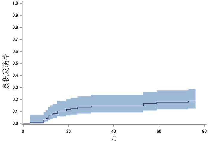 三、统计学处理采用SPSS 24.0对数据进行统计学分析。首先进行单因素分析,分类变量选择χ2检验,当统计资料中最小理论频数介于1和5之间时使用χ2检验的连续性校正公式;当最小理论频数小于1时使用Fisher确切概率法。正态分布数据用x±s表示,选择独立样本t检验。非正态分布数据使用中位数(上、下四分位数)表示,选择两独立样本的非参数检验。为最终确定肝癌发生的独立危险因素,将单因素分析提示具有统计学意义的指标纳入二元Logistic回归模型分析,P<0.05为差异有统计学意义。根据随访数据资料,使用SAS 9.4绘制HCC累积发病率曲线,计算1、3、5年的HCC累积发生率。